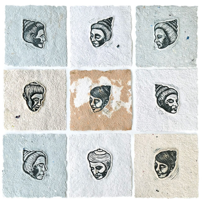 Nereïden en Triton, Lino op zelf geschept papier, 2024